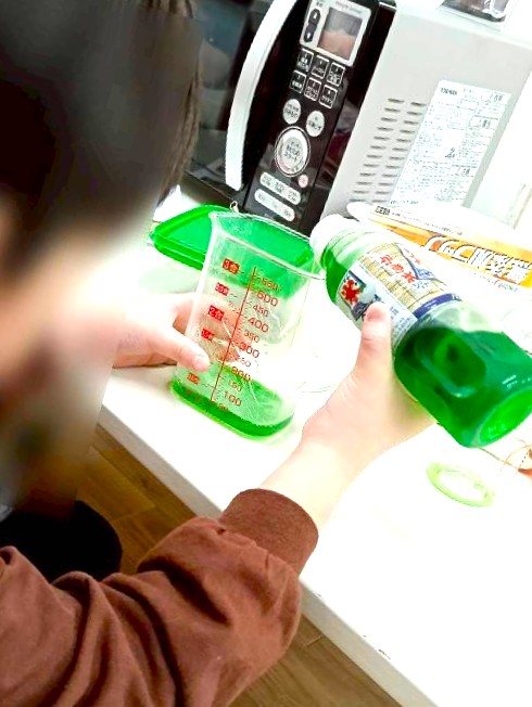 「シロップが80㎖で水が60㎖だから、140㎖まで水を足そう!」