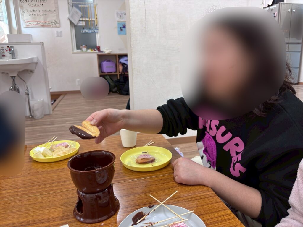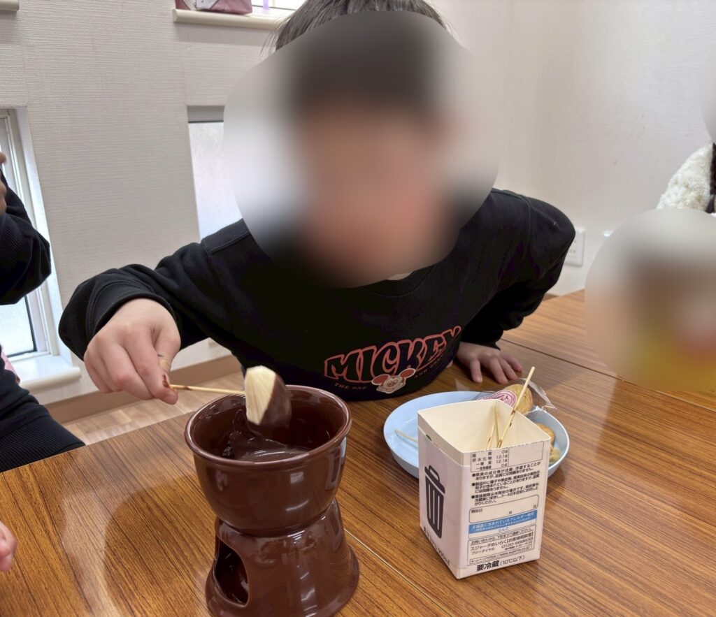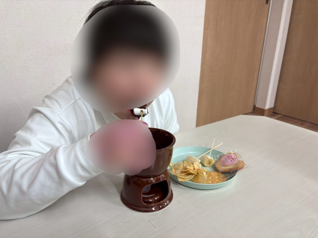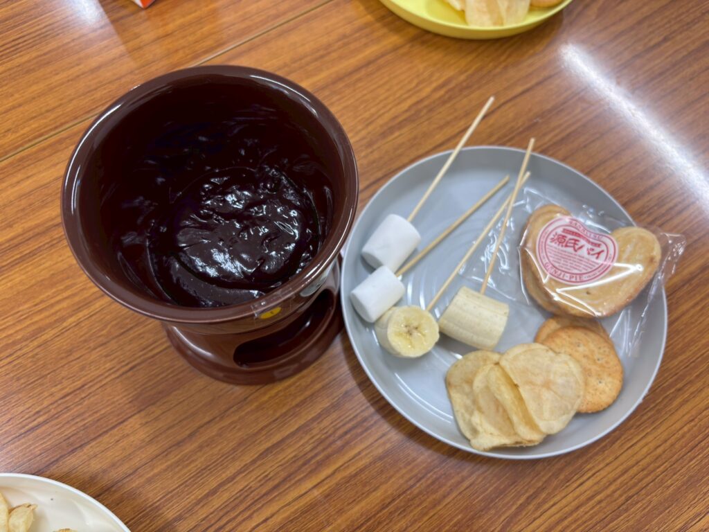 皆で机を囲み、具材にチョコレートを付けながらおやつタイムを堪能です✌✌
