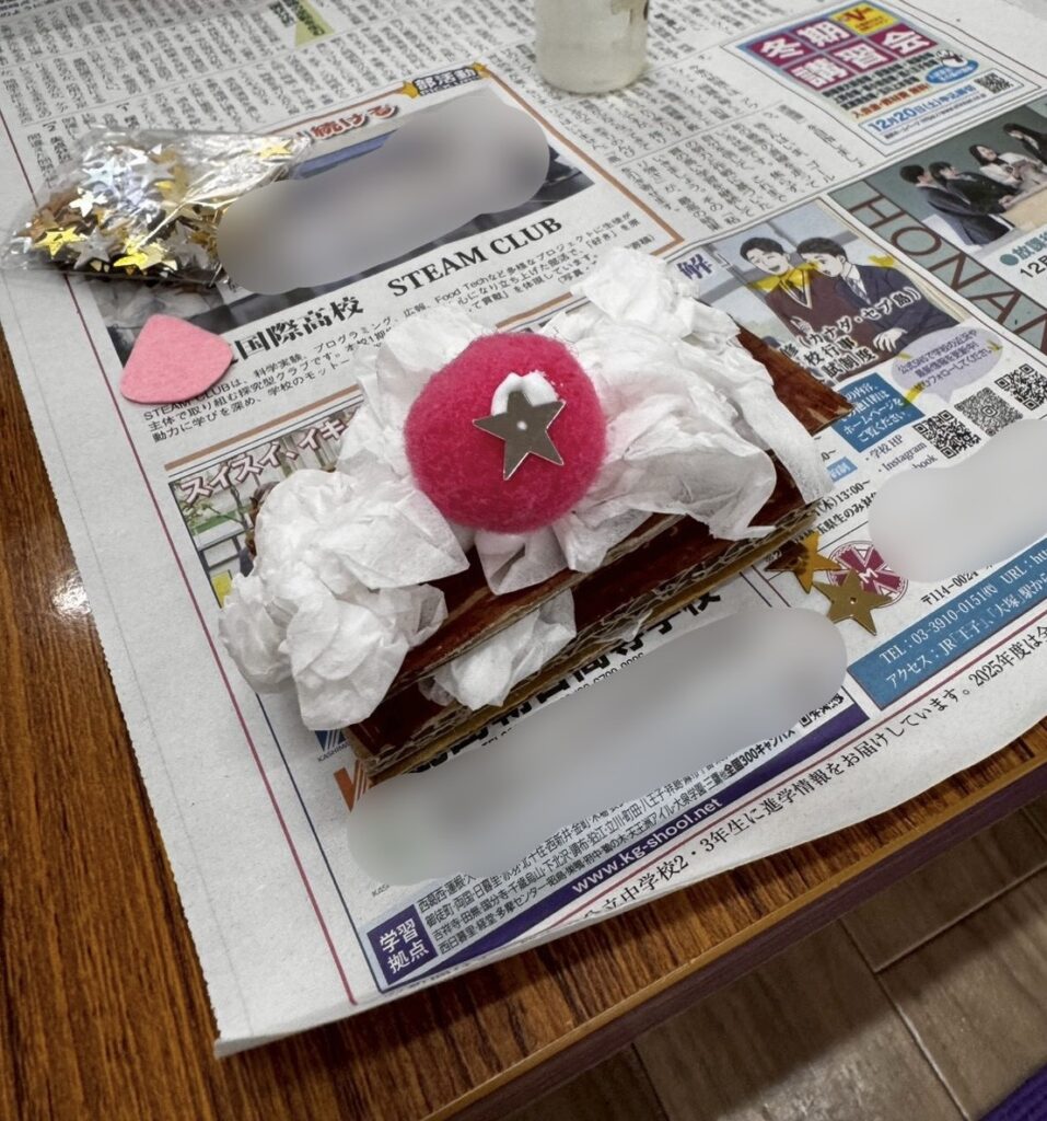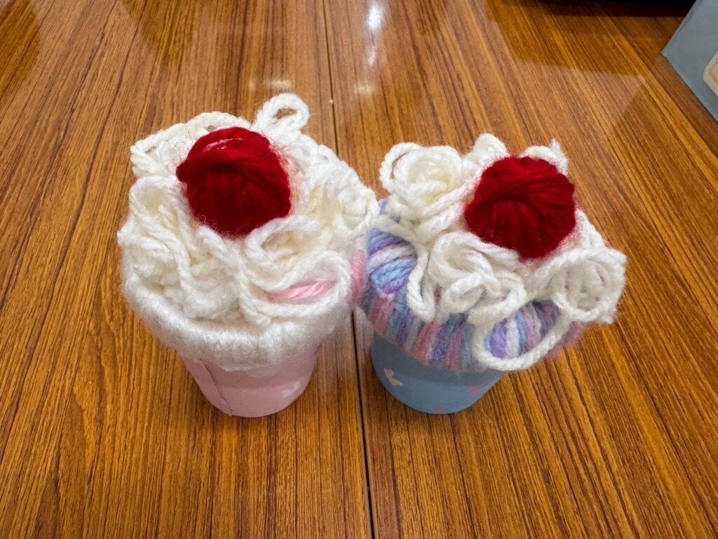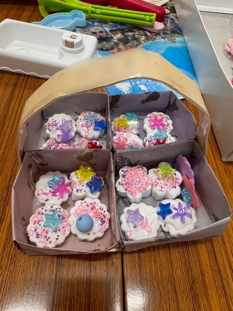 その他にも段ボールに色を塗り、花紙を貼り合わせてケーキを作ったり、紙粘土でクッキーを作りビーズやラメでデコレーションしたり、毛糸を使ってカップケーキを作るお姉さんもいましたよ!