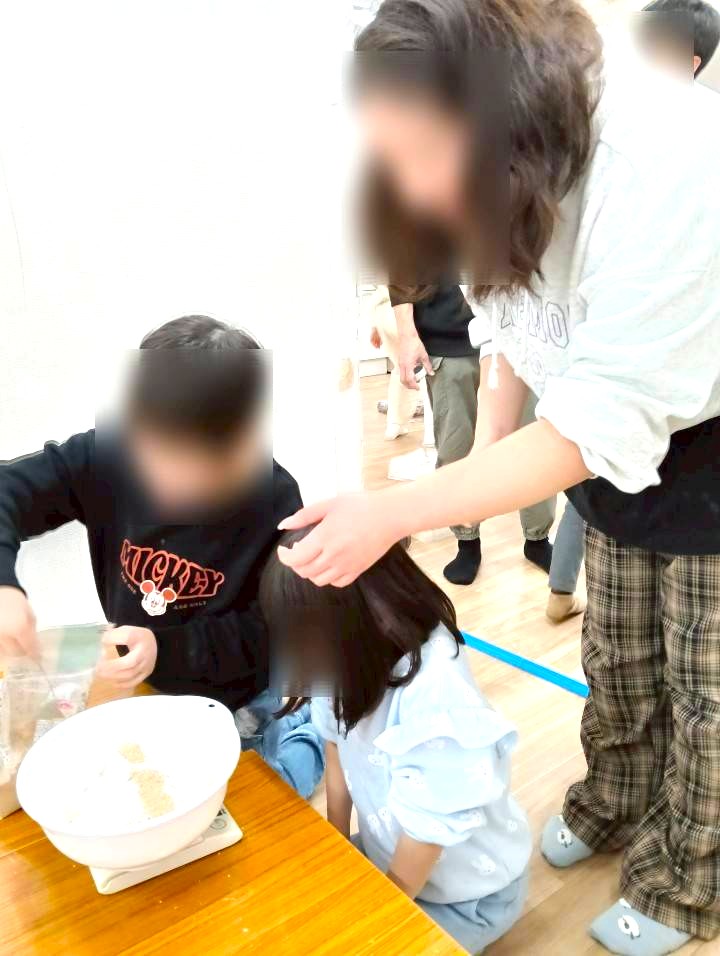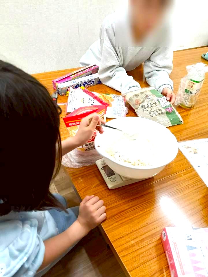 目盛りを見ながら「あと〇g! もう少しだよー」と声をかけ協力しながら計っていました⚖️