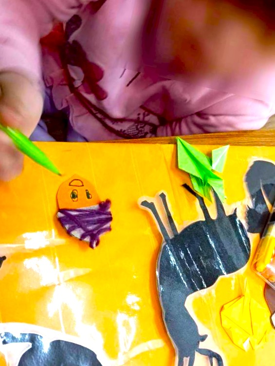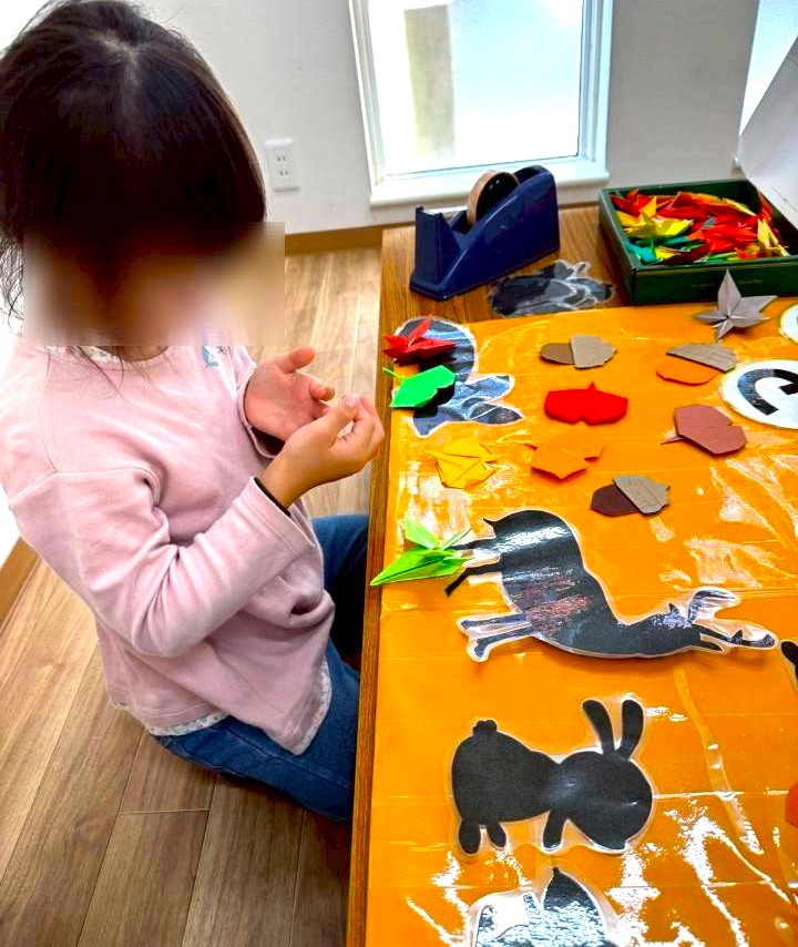 折り紙で作った紅葉にイチョウに可愛らしい動物たちのシルエットを貼り付けていきます🦊🐇