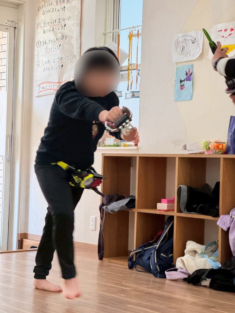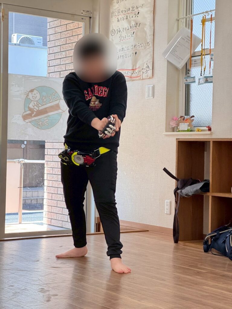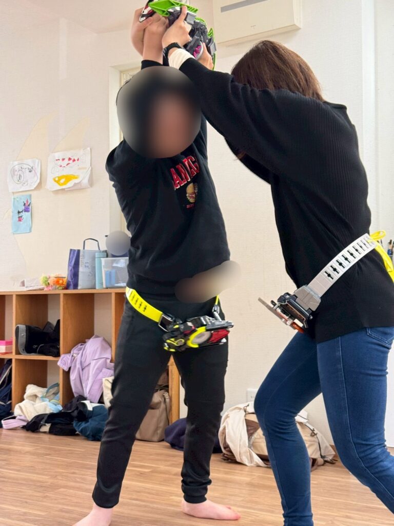 また、スタッフに戦いごっこを申し込んだお友だち。真剣な眼差しでポーズをとり、戦っているうちにとびっきりの笑顔に😊迫力満点な戦いを見せてくれました!