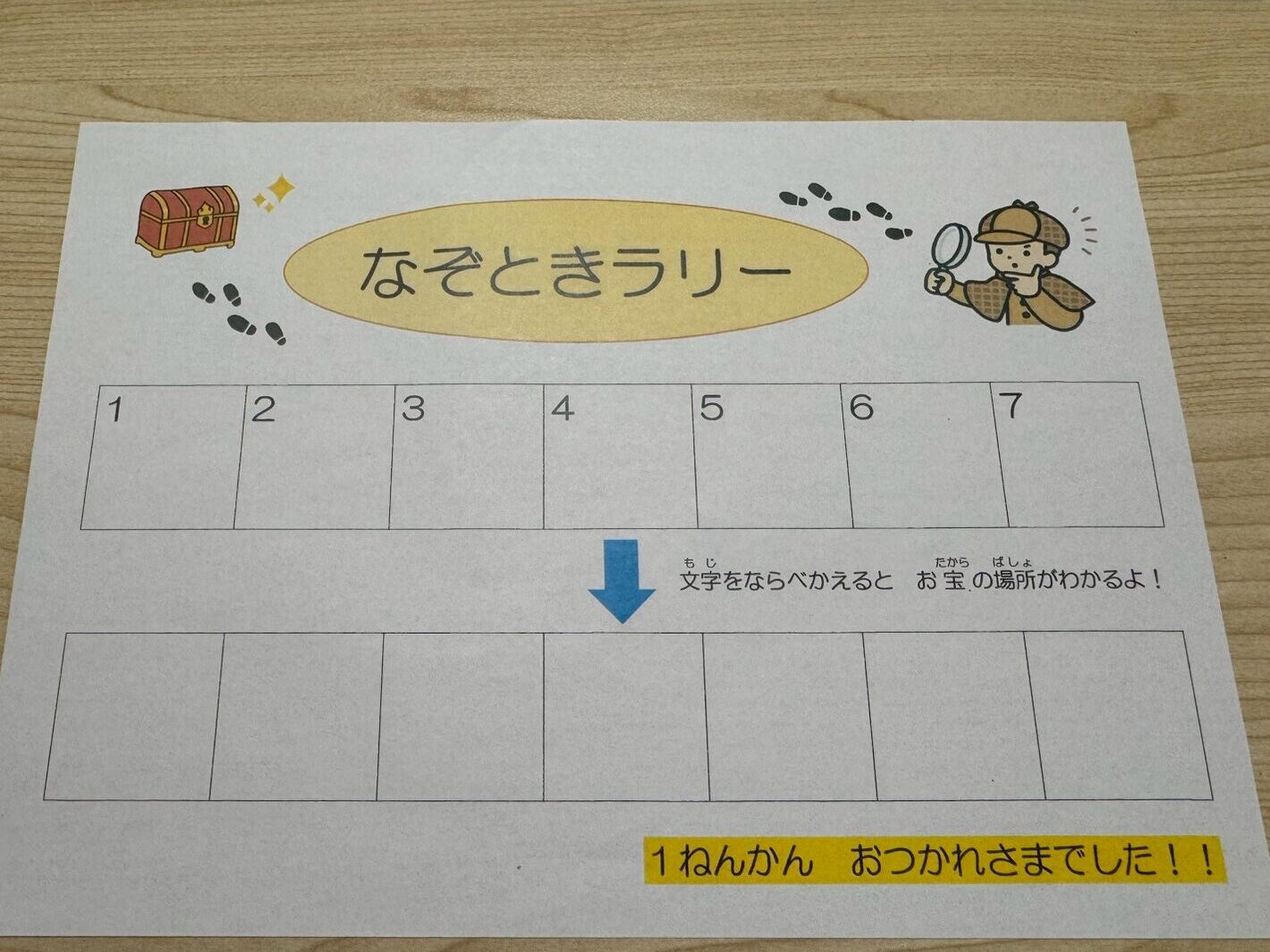 1問ずつ謎を解き、7個の文字を集めます。最後に文字を並べ替えるとお宝のありかが分かるのです!