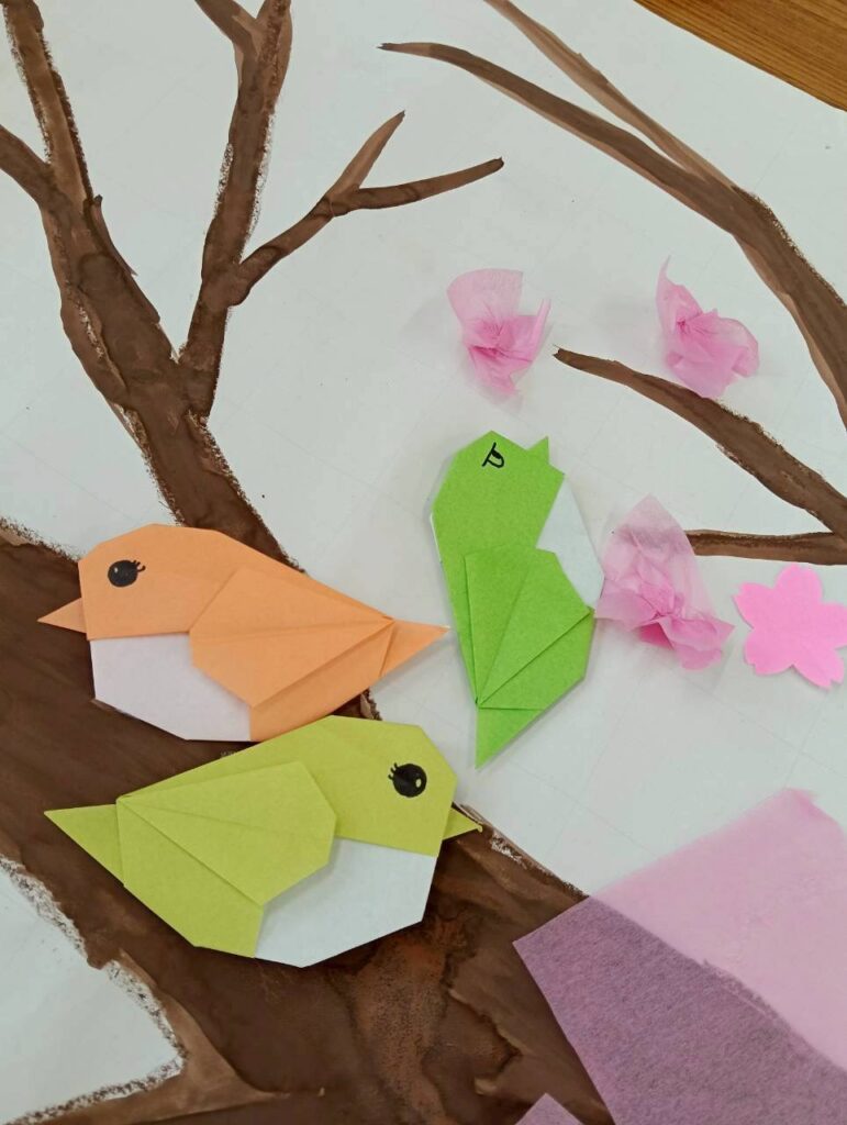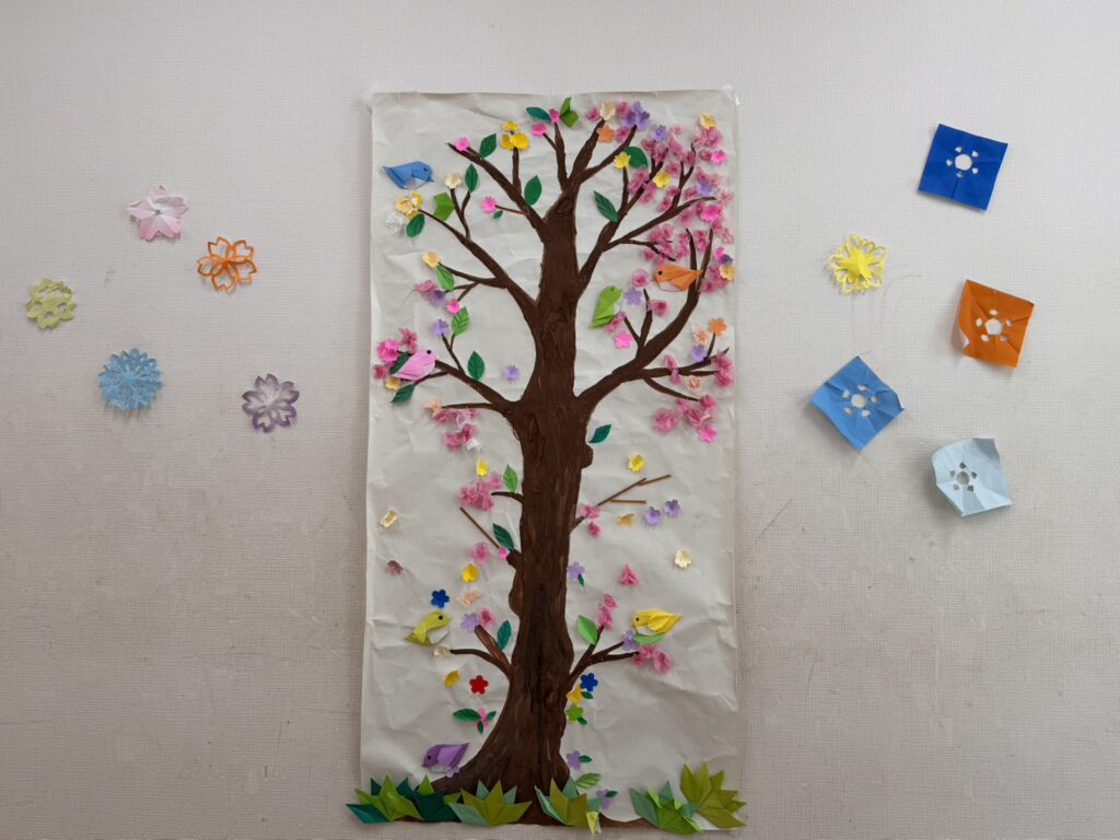 また、桜の製作も行いました!初めは「やらない~」と言っていたお友だちもいざやり始めたら、集中して沢山の花を咲かせてくれ、こどもラボにも大きな桜の木が飾られました🌸