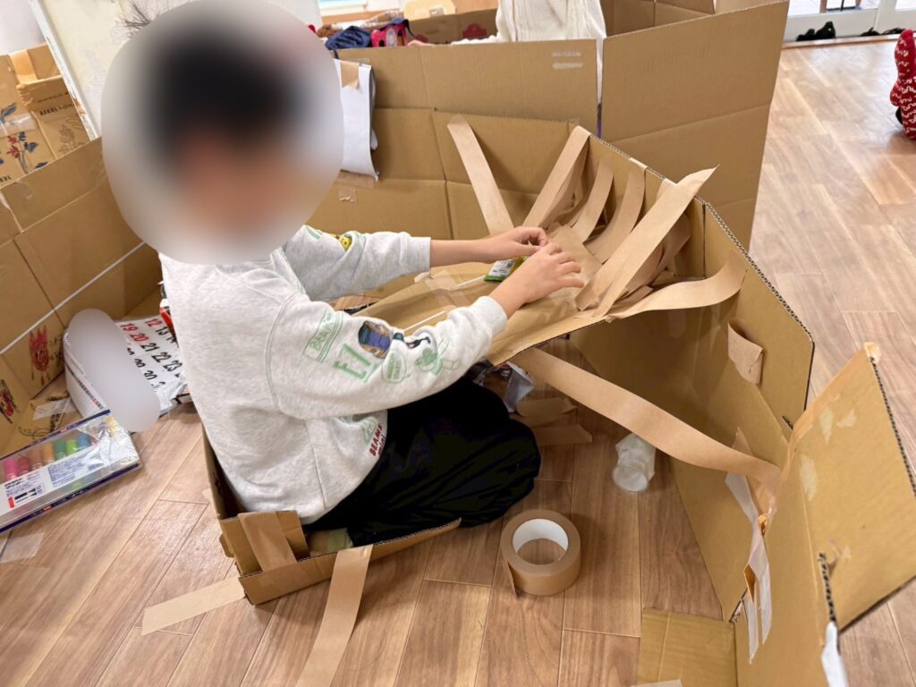 また、段ボールを使用して各々のお部屋を作るこどもたち。新幹線の車内にある収納式テーブルを作るなど素敵なお部屋を作っていました🎵完成したお部屋の中を覗いてみると、、、おやつを食べたり、カードゲームをしたり、お昼寝をしてみたり🤭