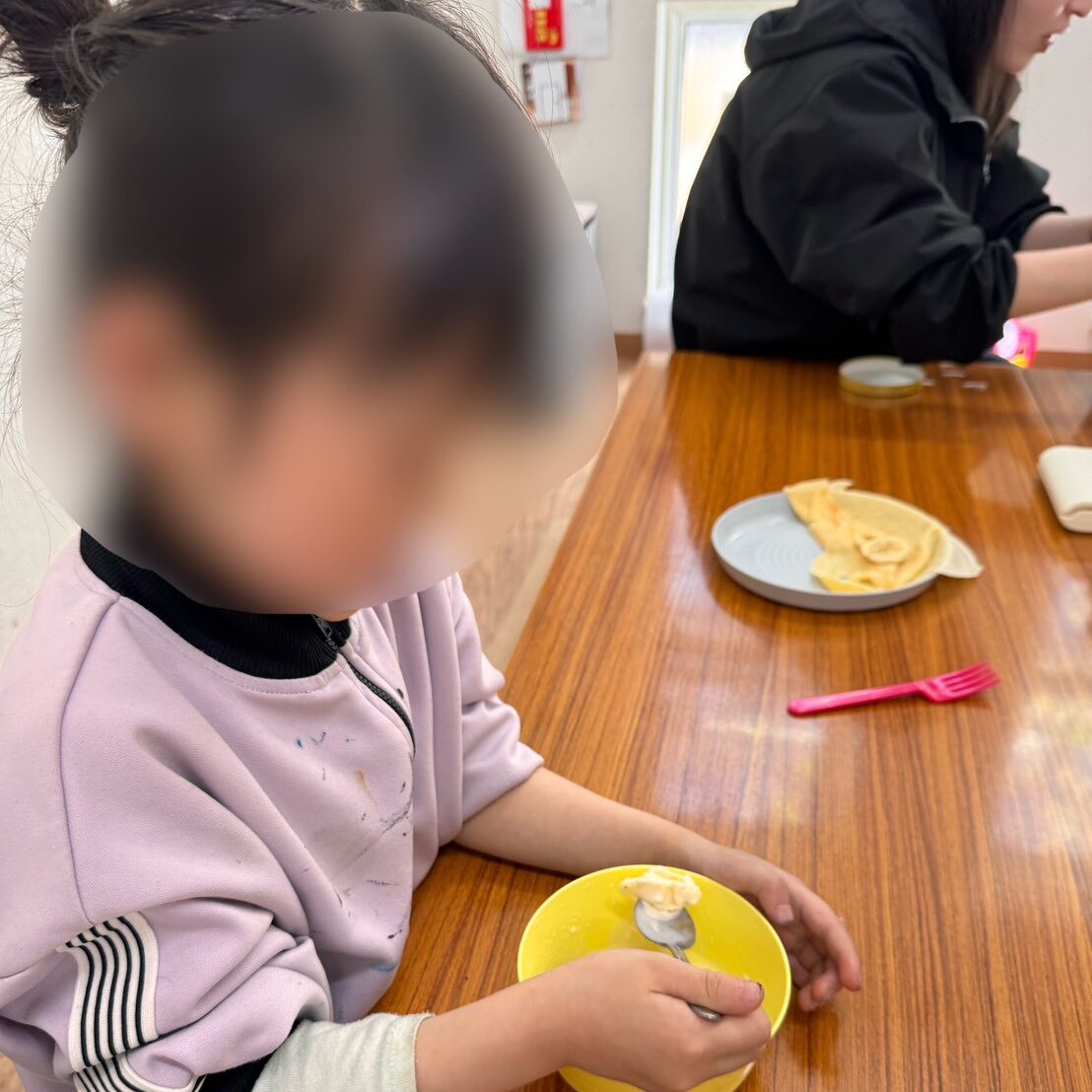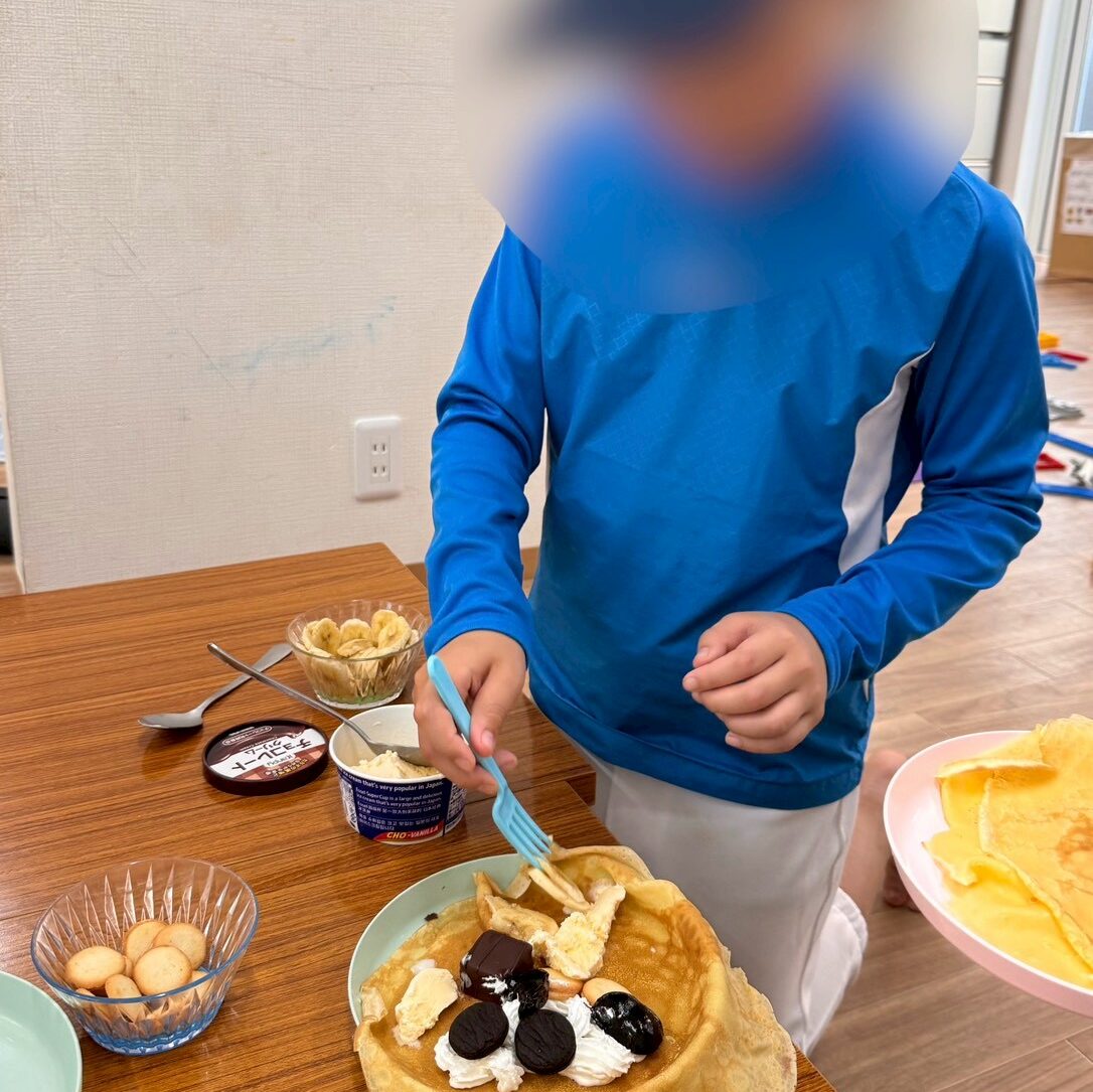 「クレープってどうやって作るんだろう?」「2回目は入れる材料を少なくしてみたよ!」と本格的なクレープ作りに挑戦するお友だちやお皿に好きな材料を盛り付けて頬張るお友だちなど、新しいお友だちも加わった当日でしたが、明るく楽しい会となりました😊