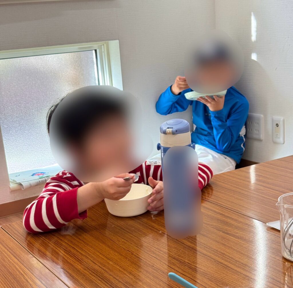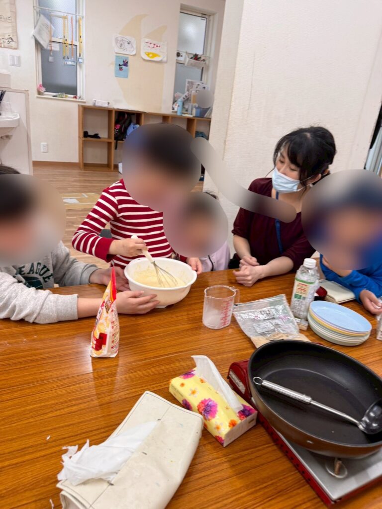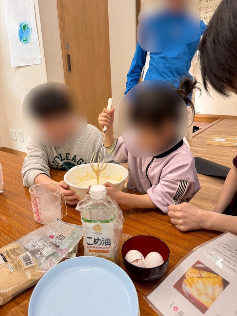 卵を割る係、混ぜる係と役割を分担しながら生地を作っていきます🥣