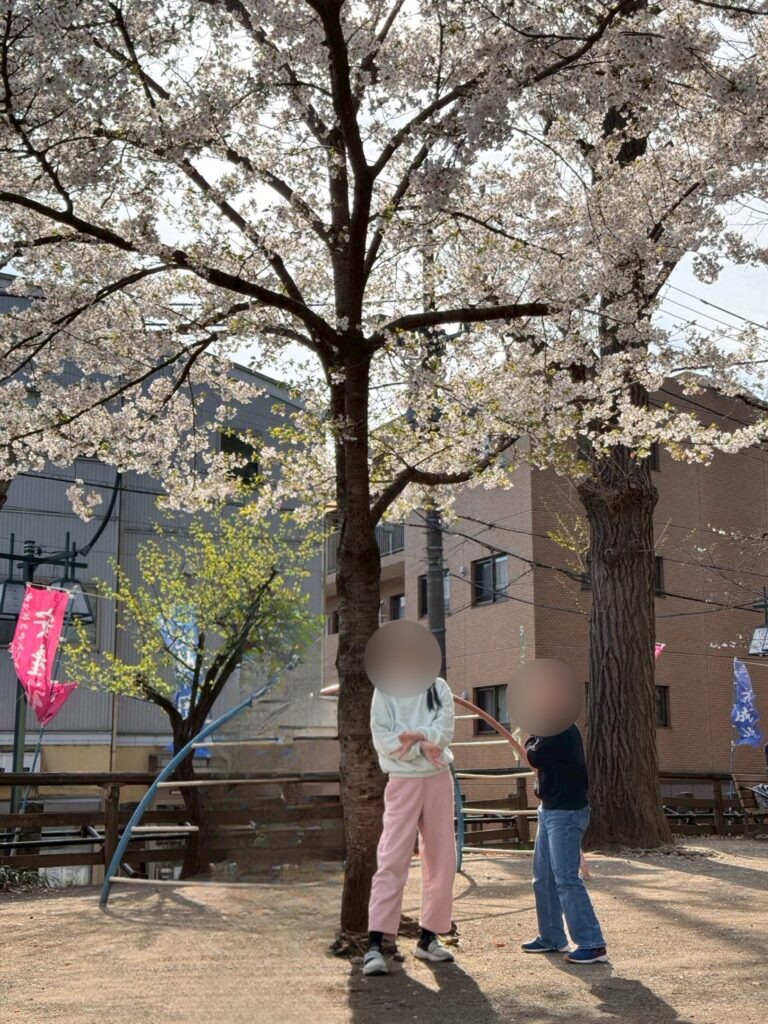桜が満開の中、天気がいい日には近くの公園へお花見に出かけたり、鬼ごっこなどをして体を動かしたりしました。